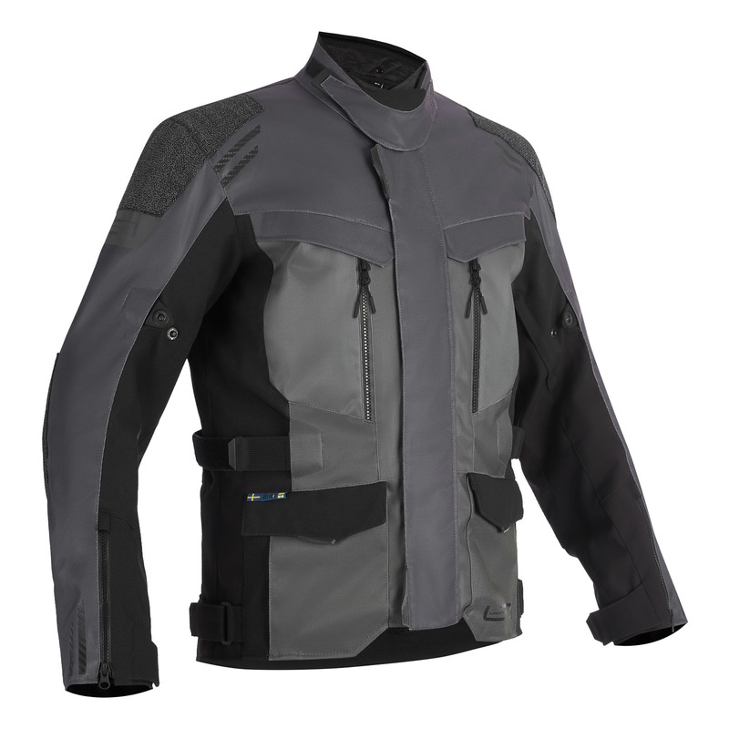 Vatten- och vindtät samt ventilerande laminerad 2-lagers textiljacka med stretchegenskaper. CE certifierad, klass AA.